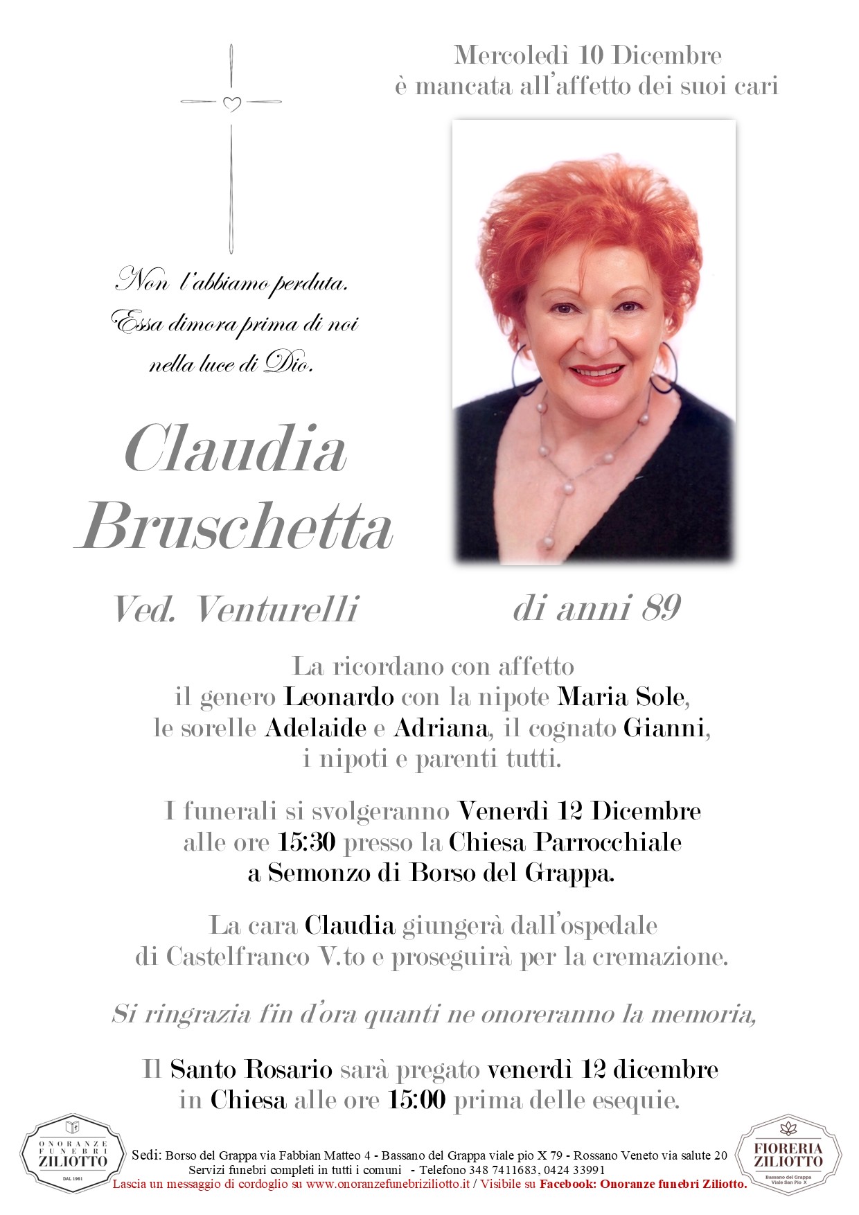 I funerali si svolgeranno Venerdì 12 Dicembre