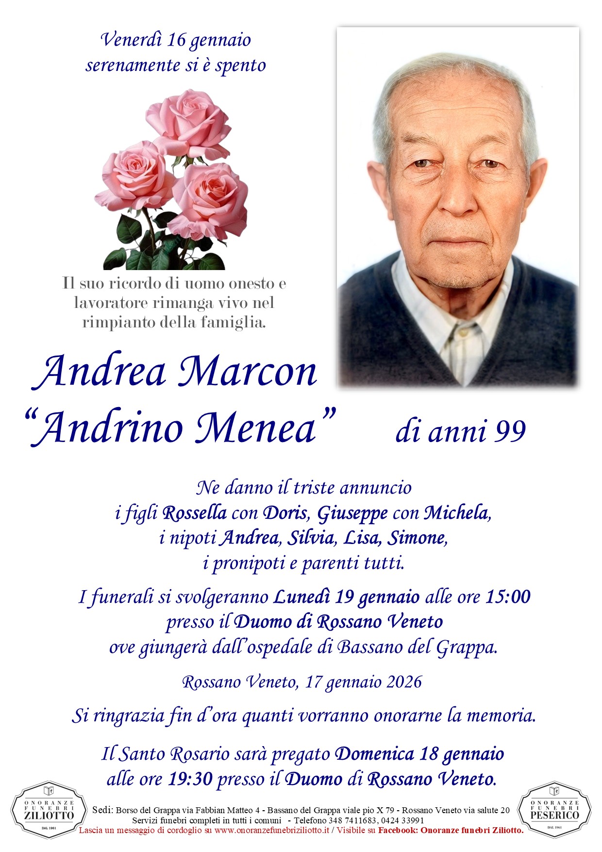 I funerali si svolgeranno Lunedì 19 gennaio alle ore 15:00