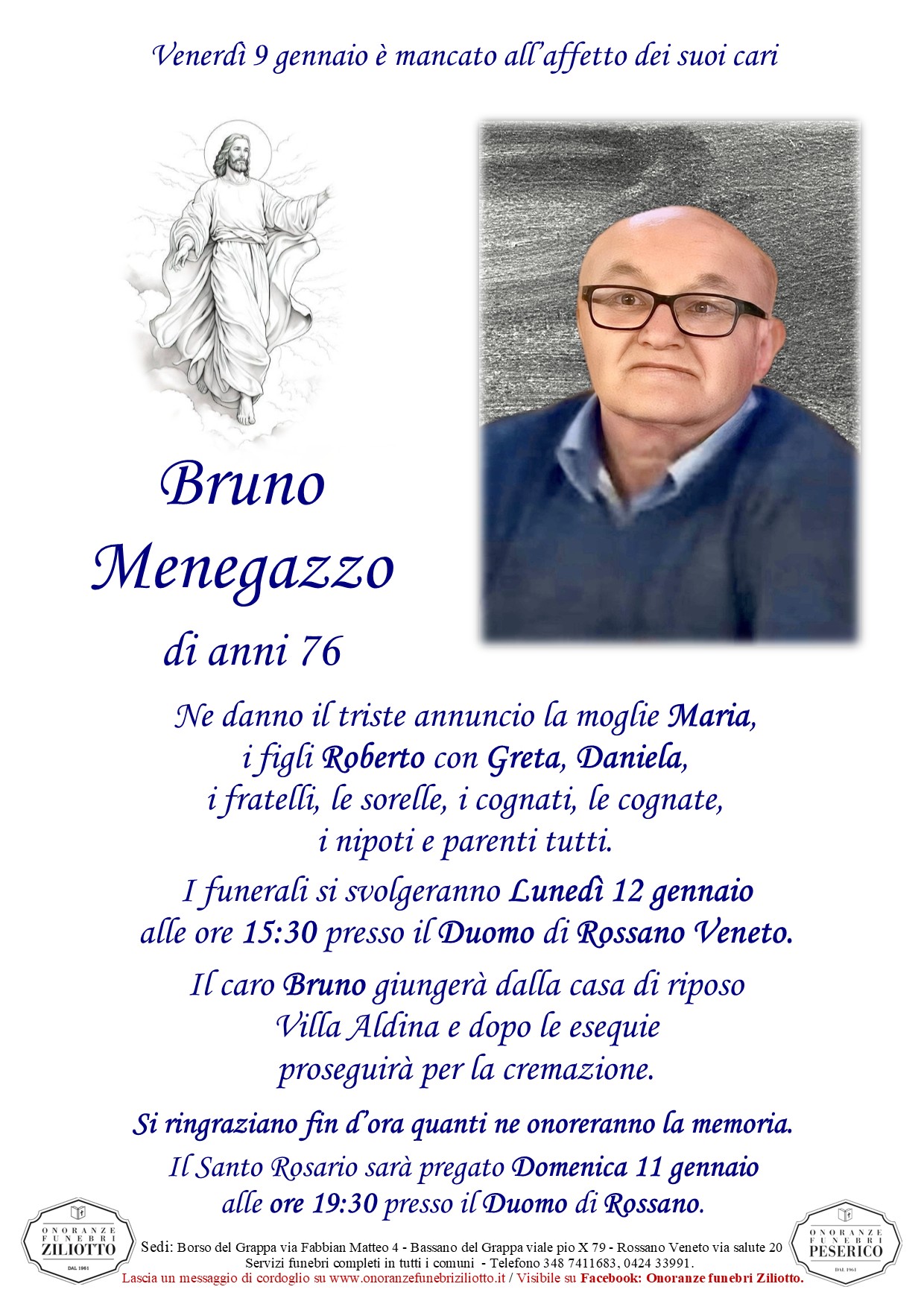 I funerali si svolgeranno Lunedì 12 gennaio alle ore 15:30 presso il Duomo di Rossano Veneto. Il caro Bruno giungerà dalla casa di riposo Villa Aldina e dopo le esequie proseguirà per la cremazione.