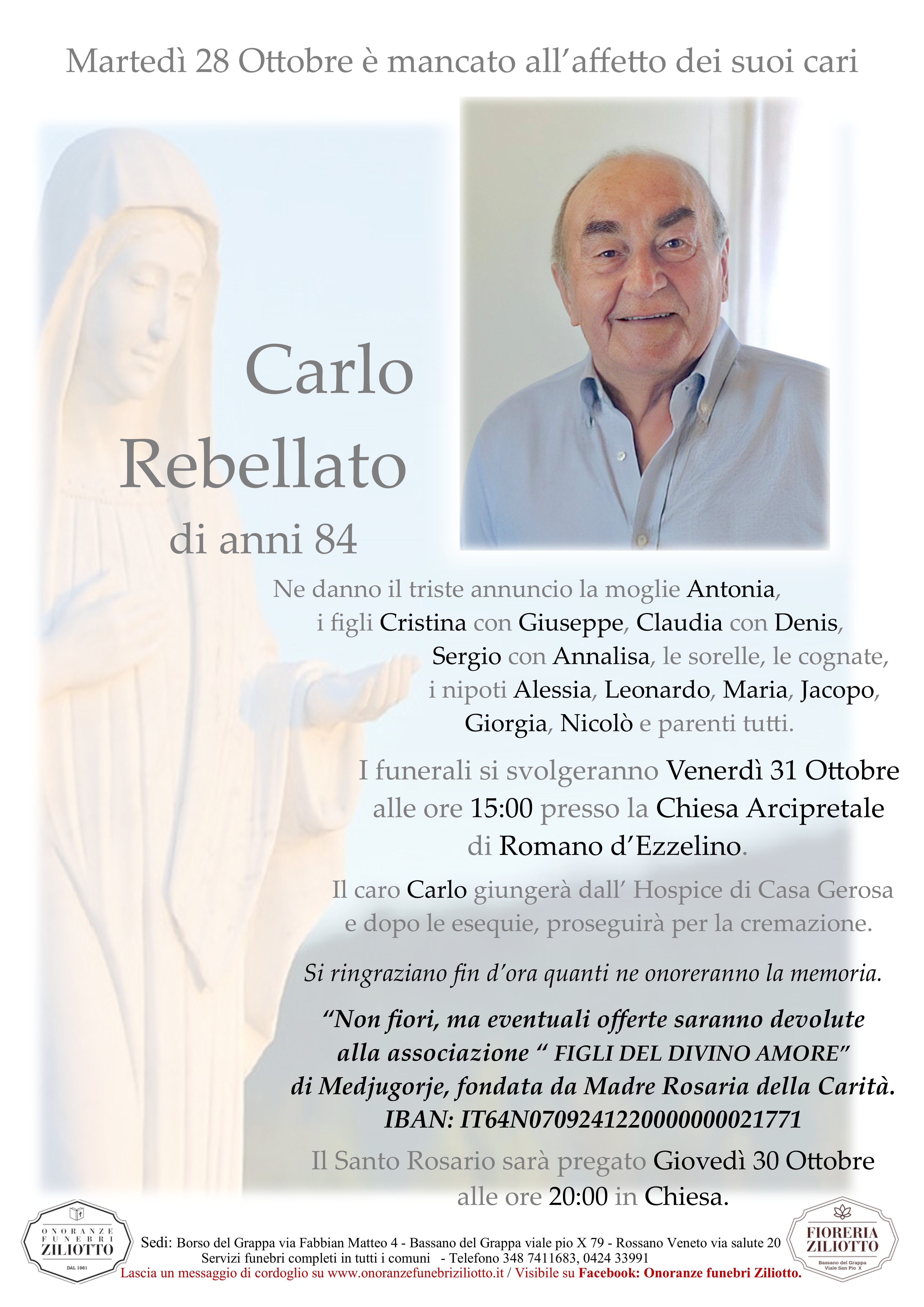 I funerali si svolgeranno Venerdì 31 Ottobre