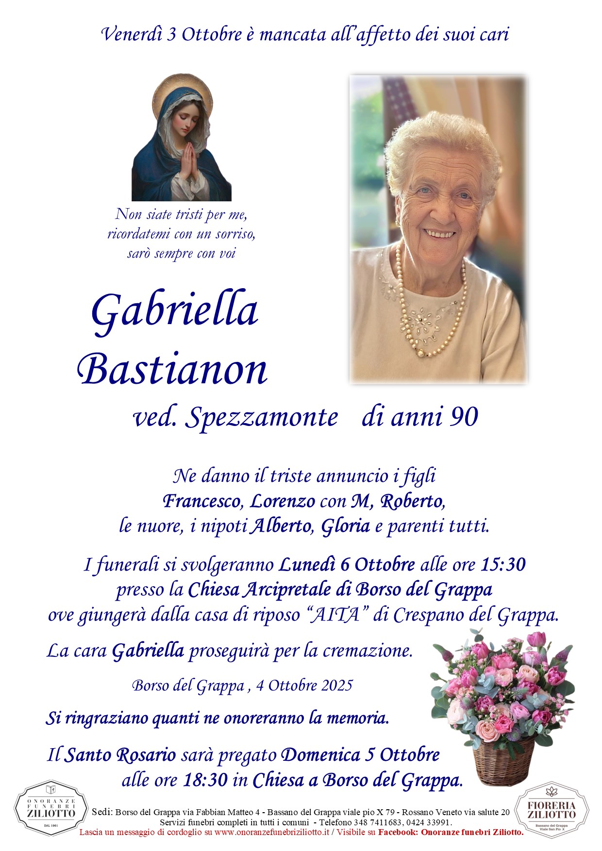 I funerali si svolgeranno Lunedì 6 Ottobre alle ore 15:30 presso la Chiesa Arcipretale di Borso del Grappa ove giungerà dalla casa di riposo “AITA” di Crespano del Grappa. La cara Gabriella proseguirà per la cremazione.