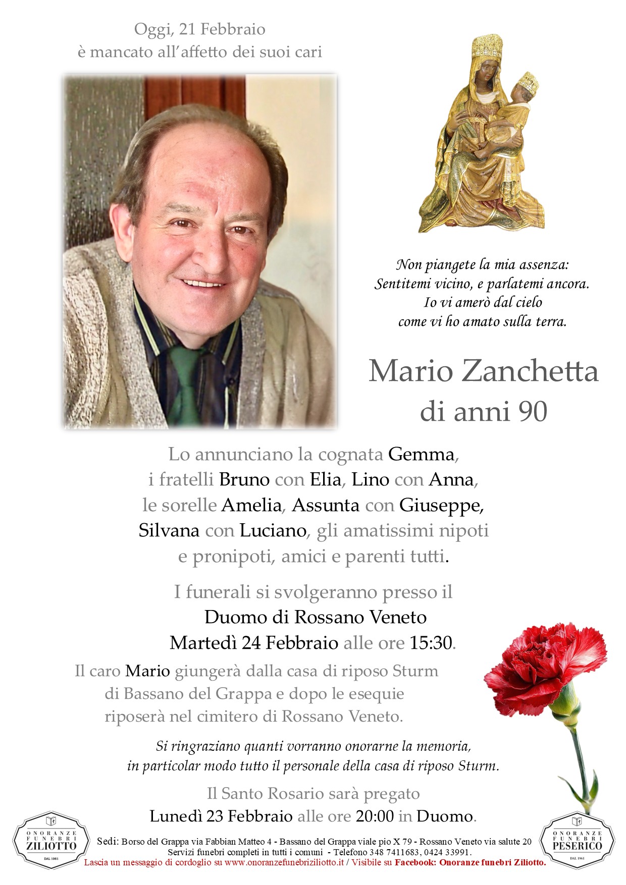 riposerà nel cimitero di Rossano Veneto.